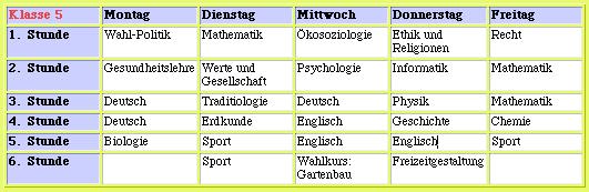 Die Grundschule dauert heute sechs Jahre und soll den Kindern allgemeines Grundwissen vermitteln. Englisch wird als erste Fremdsprache weltweit ab der ersten Klasse unterrichtet. Das gleiche gilt für Politik. Neben den klassischen Fächern sind einige neue hinzugekommen, die die Kinder die ganze Schulzeit oder einen Teil davon begleiten. Schauen Sie sich dazu doch mal Lenas Stundenplan näher an, der auf Ihrem Schreibtisch-PC zu sehen ist! (Manche Fächer lassen sich natürlich wieder anklicken)