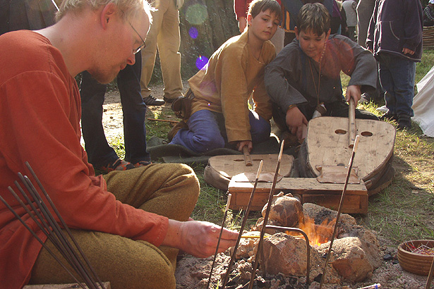 Er und Guntram unterstützten den Glasperlenhersteller, der geschickt glühendheiße Glasstäbe um einen Metallstab wickelte, so dass schöne bunte Wickelperlen entstanden. Als Lohn bekamen die beiden je eine Glasperle geschenkt.